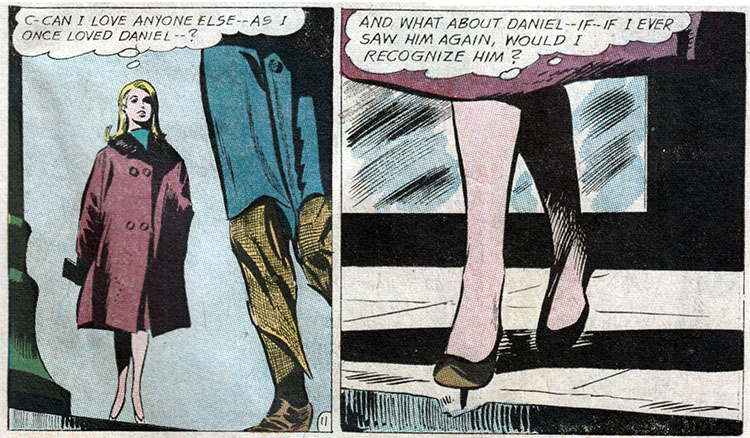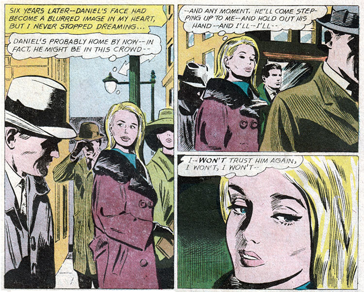 SIX YEARS LATER she's wandering the streets, every minute filled with an internal monologue all about what DANIEL is probably up to this very minute, he'll probably just walk right up to her any minute now, that would be just like him, wouldn't it? Isn't that right, DANIEL?? (she whirls around, points at nothing)