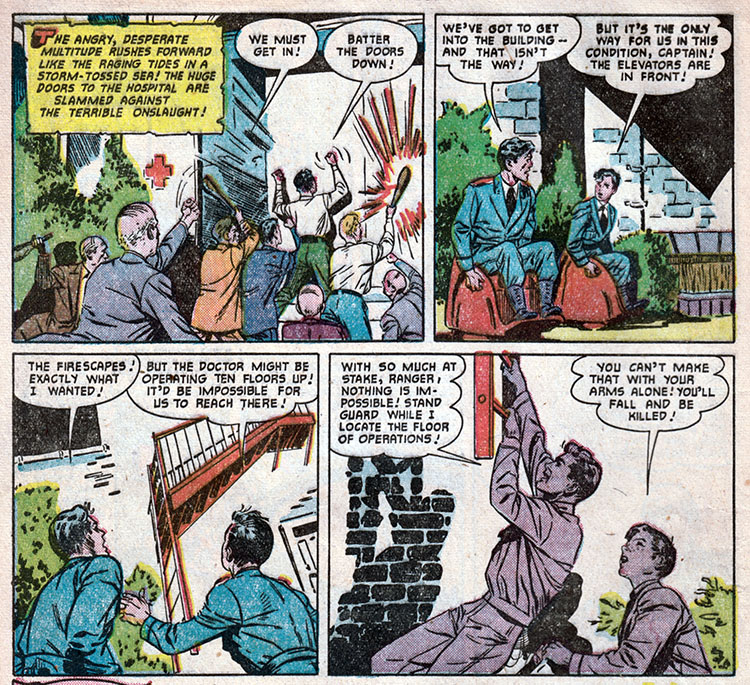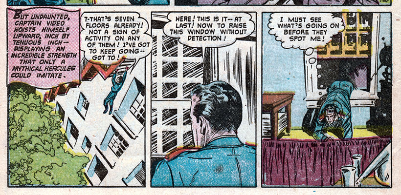 Crawl up the top side of those fire escape stairs? Not Captain Video, he's gotta do it the hard way, the big show off.