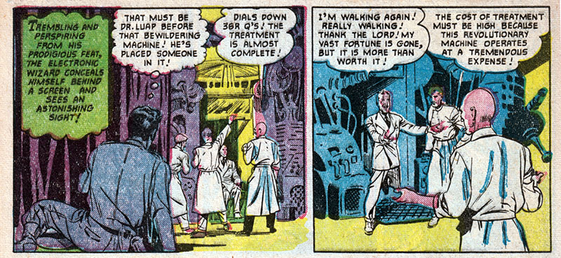 Obviously this leg paralysis business needs to be investigated by a general meeting of the medical board, who, for some reason, can't just telephone each other, they need to meet in person. And how are they going to do that if they can't walk? If only some scientific genius would use his mental wizardry and create the Americans With Disabilities Act, thereby mandating accomodations for people with mobility issues! Oh well. Say, that Whirlojet sure is nifty.