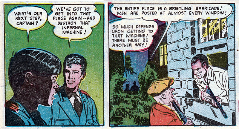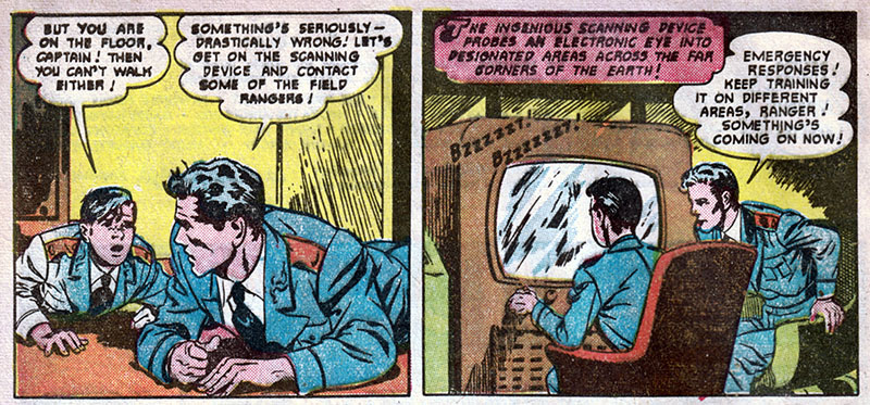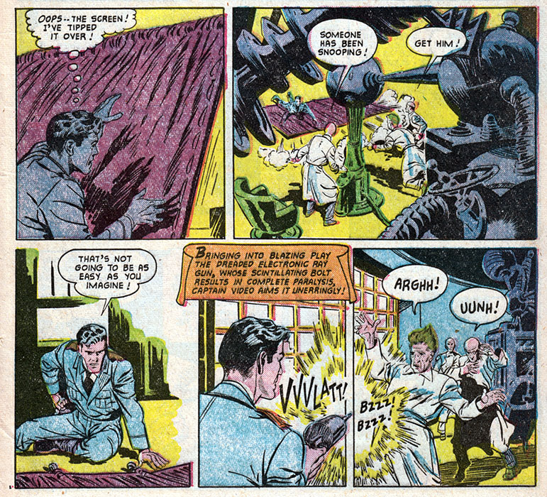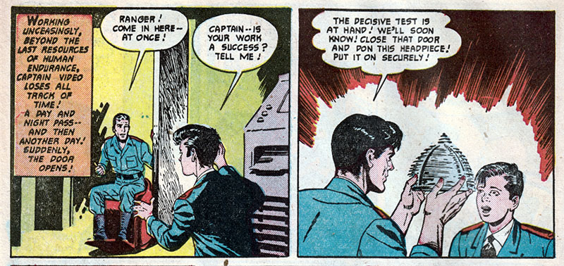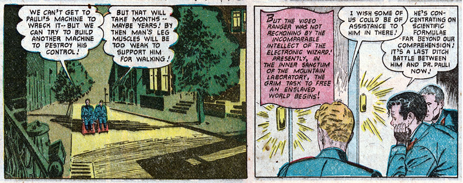 Presently in the inner sanctum of Captain Video's mountain laboratory, the grim task of trying to figure out how to wreck a paralyzing machine is undertaken. Cut off the electricity? Send in the Marines? Bomb it back to the Stone Age? Which incomprehensible scientific formula will be the solution?