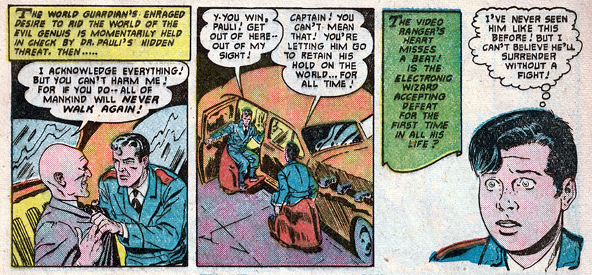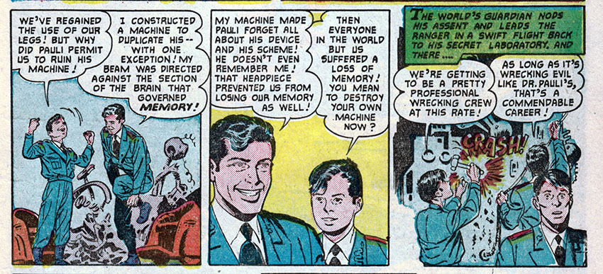 Kind of an eerie smile on Captain Video's face here as he describes how he invented a new ray that makes everyone in the world forget everything, sort of a global electronic "roofie." Hope none of the billions of people on Earth were in the middle of doing anything important when he threw that switch!