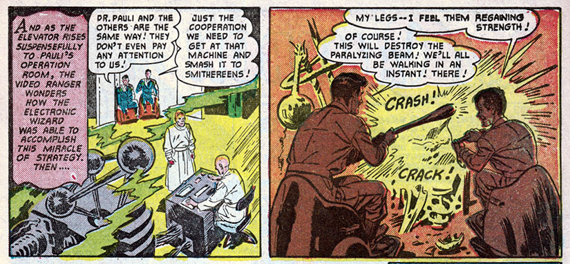 Using all his towering intellect and amazing scientific wizardry, Captain Video... smashes a thing with a stick.