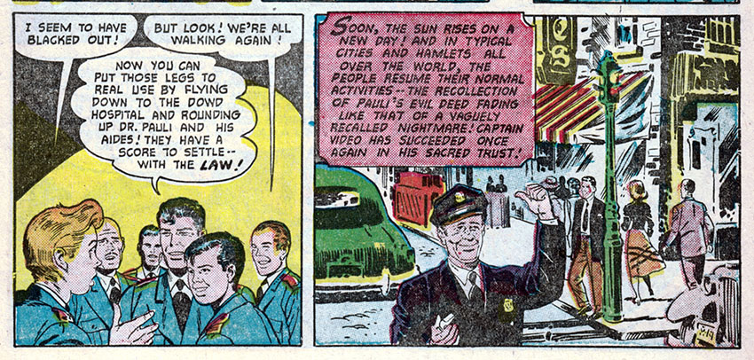 Soon the sun rises on a new day as people resume their normal walking-around activities, proof that the incomparable genius of Captain Video, and his ability to whack things with a big stick, has succeeded in making man walk again! Also that one lady there, she's walking too.
