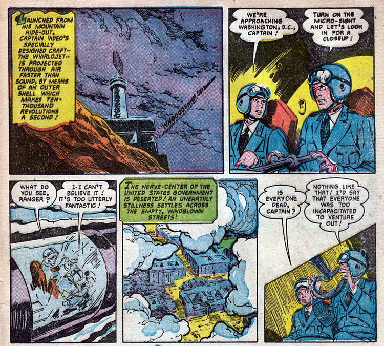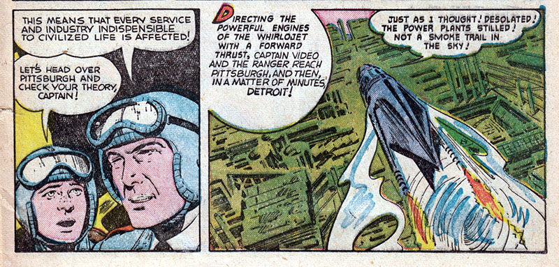 Detroit and Pittsburg's industrial might silenced, their factories and mills no longer manufacturing American goods? Again, who says science fiction can't accurately predict the future? One thing's for sure, Captain Video could have stayed in his mountain hideout and used his ingenious scanning device to see these things. But that wouldn't let him show off the Whirlojet, now would it?