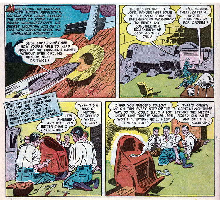 Captain Video is SO incredibly amazing that not only can he ram the Whirlo-Jet right into that tight-fitting, possibly Freudian tunnel, but his superior intelligence has enabled him to envision and create a revolutionary new device no one else in the history of the world could ever have dreamed up ever in a million years -a wheelchair with a motor.